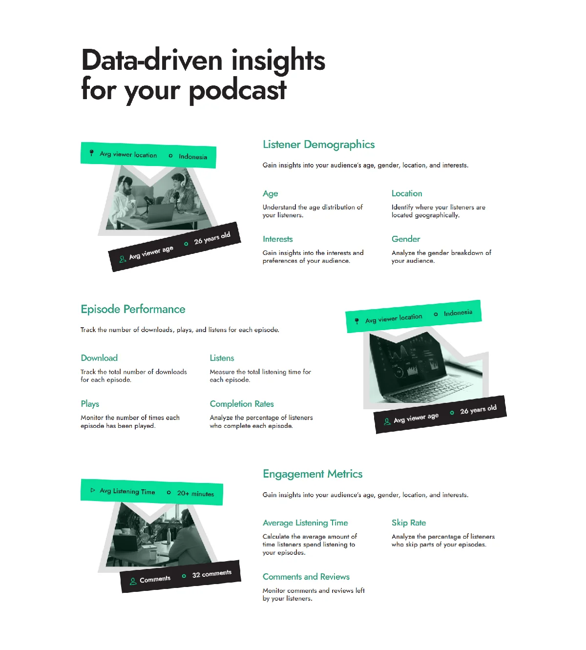 Track the number of downloads, plays, and listens for each episode.
