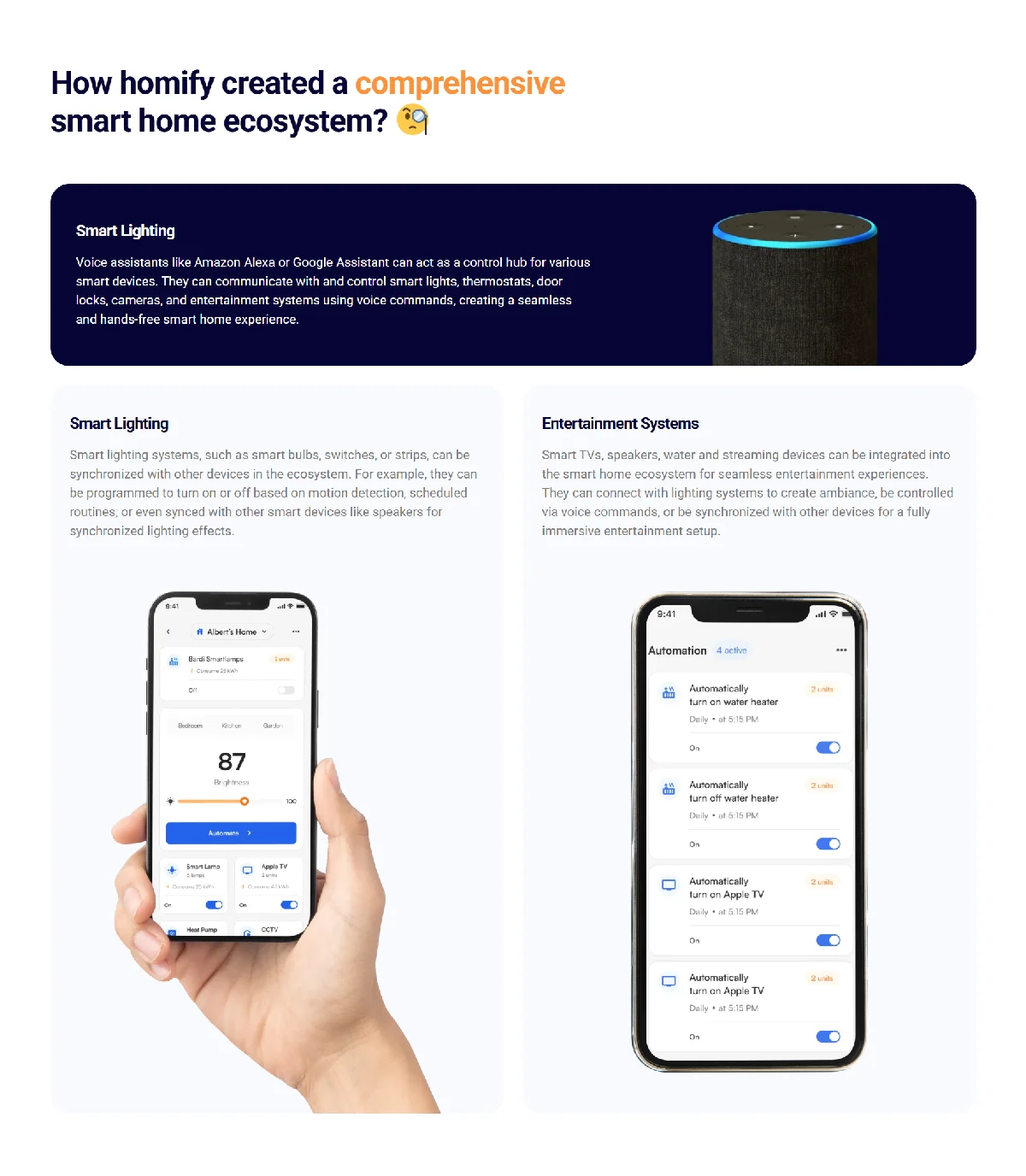 Smart lighting systems, such as smart bulbs, switches, or strips, can be synchronized with other devices in the ecosystem. For example, they can be programmed to turn on or off based on motion detection, scheduled routines, or even synced with other smart devices like speakers for synchronized lighting effects.